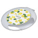 Compact mirror with a cute pattern of yellow lemons with green leaves and fresh cut lemon slices. A white rectangle layered over top with your text inside.