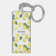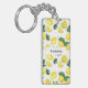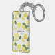 A keychain with a cute pattern of yellow lemons with green leaves and fresh cut lemon slices. A white rectangle layered over top with your text inside.