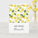 Happy birthday greeting card with a cute pattern of yellow lemons with green leaves and fresh cut lemon slices.