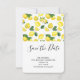 Birthday save the date card with a cute pattern of yellow lemons with green leaves and fresh cut lemon slices.