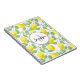 A spiral notebook personalized with a monogram initial and name inside a white circle with a black rope border. Designed with yellow lemons and green leaves, in a repeating pattern.
