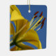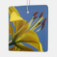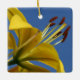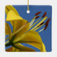Close up photo of a beautiful yellow lily against a clear blue sky.