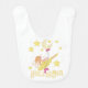 Cute ballerina bib of white with a ballerina in a yellow tutu and ballet slippers swinging from the moon, surrounded by yellow stars and yellow text reads Ballerina.