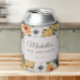 Pretty mustard yellow and navy blue watercolor floral with gold glitter on tan 40th birthday party custom drink cooler. Personalized with the name of the guest of honor, her age, and her party date. Contact me for help with customization or to request matching or coordinating Zazzle products.
