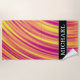 This beach towel design features a pattern that resembles curved ripples in water, colored various shades of colors like yellow, orange and purple. It also features a custom name in white colored text within a dark colored area on the front. [~Z0000000]