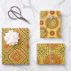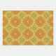 Set of three wrapping paper sheets with different decorative patterns. Each pattern features geometric shapes in yellow and orange shades.