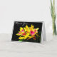 Close-up photograph of a cluster of gorgeous yellow orchid flowers with vibrant pink centers with their green foliage and black background covers the front of this blank floral note card. This card can be used as a Thank You card, a Birthday card, or any other card of your choice. Customize it with your text and/or pictures to make it one-of-a-kind! (YOC001)