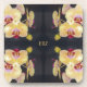 The original artwork by HomeWare on this Coaster was made from an original photograph of orchid flowers, specifically P. Chain Xen Queen, Yellow/Red Lip. It is a closeup photo, a detailed view of the light yellow flower petals surrounding deep red lips at the bloom's center. There is also a touch of lavender before the petals turn to yellow. The background of the orchid pattern is in shades of deep gray to black. In the center of the design, there is monogram text in a light gold color. This is set to personalize, or delete if you prefer.