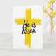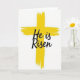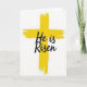 This design shows a large yellow sacred symbol centered on a white background, painted with wide, textured strokes that leave slightly rough edges for an organic look. The bright yellow shape stands alone in the open space, giving the scene a sunny, early-morning feel that suits Easter 🌷. Across the middle of the yellow form, the words “He is Risen” appear in flowing black lettering, easy to read against the warm color. The dark text sits confidently on top, like a steady voice laid over the energetic paint texture. The contrast between the smooth, curving letter shapes and the uneven brushy surface creates a gentle push-and-pull, like two close friends balancing each other. With so much white around it, the central symbol feels spotlighted, drawing your eyes straight to the message. The yellow paint shows visible streaks and thicker patches, while the black lettering runs cleanly across the centerline 🐇.
