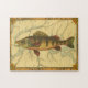 This print illustrates an artistic picture of a yellow perch fish. The background displays a vintage geographic map in light beige colors. The brown frame resembles old wood pattern with yellow-red flowers in the edges. A great addition to your fishing collection!