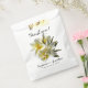 Floral wedding favor bags to say “thank you” to guests. Yellow and white plumeria flowers design with text above and below the realistic bunch of flowers. Include names of the bride and groom with wedding date. White bags come in sets of 50 in two paper types.