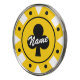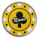 Poker chip golf ball marker personalized with name or value. Fun casino marker coin design with clover icon. Customizable colors. Yellow and black example. Personalize with golfer name, monogram, initials, dollar amount, denomination or lucky number. Script typography. Also great as wedding party favors. Cool gift idea for golfing dad, husband, brother, grandpa, coach, caddie, high roller, boss, coworker etc.