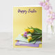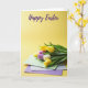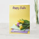 This card shows a still-life scene of spring flowers arranged with a gentle, friendly mood 🌷. A full bouquet of tulips sits along the lower part of the design, with petals in sunny yellow, soft white, and deep purple nestled among fresh green leaves. Just beneath the stems, three small cards are stacked like a tidy little gift, suggesting a thoughtful exchange between close friends or a couple. The top card is mint green with small yellow dots, resting on a pale gray card, which sits on a light lavender card for a calm layer of pastels. The background is a smooth butter-yellow gradient that keeps the scene warm and open, leaving plenty of space above the flowers. Near the top, a flowing violet message is centered in the open area, standing out clearly against the yellow field 🐰. Soft, diffused lighting keeps shadows minimal and lets the paper edges and tulip petals look gently textured, with the purple lettering hovering above the bouquet.