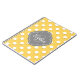 A cute, girly, yellow and white polka dot pattern background with a grey quatrefoil label frame featuring a customizable name / monogram template.