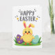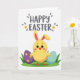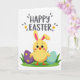 This card shows a sunny yellow little bird-like character with long bunny ears, standing front and center as if leaning in for a friendly spring hello 🐰. The ears are lined in bright pink, and its wide dark eyes, tiny orange beak, and rosy cheeks give it a tender, affectionate look. It stands on a narrow strip of green grass with small orange webbed feet showing, nestled between two large decorated egg shapes. On the left, a deep purple egg features three yellow flowers with orange centers, arranged like a small bouquet offered to a friend. On the right, a light blue egg is dotted with yellow spots, adding a light, cheerful rhythm beside the character 🐇. Across the top, the greeting “HAPPY EASTER” sits in soft charcoal gray, centered and large, with small gray teardrop marks and tiny yellow flowers scattered around it. The background stays bright white, making the purple, blue, yellow, and green shapes stand out with crisp edges and simple flat color. Tiny gray teardrops and little yellow blossoms float near the top text, echoing the flower details on the purple egg.