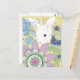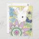 A sweet white bunny rabbit hides among stylized flowers and leaves in this cheerful and colorful postcard.