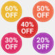 Round 60% off sales stickers in yellow, orange, red, pink, and purple with customizable text so you can personalize the sale.
