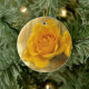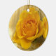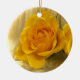 This lovely holiday ornament features a still life composition of an exquisite yellow rose on a beige background. The petals range in color from pale yellow through gold to a deep orange.