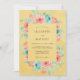 A vibrant display of coral and teal blossoms cascades around a warm yellow background. Delicate pink roses intertwine with lush greenery, creating a lively and romantic atmosphere. This design evokes a sense of joyous celebration.