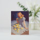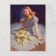 Classic PinUp card showing a beautiful PinUp Girl posing on the floor in a white gown and a bouquet of yellow roses, painted by Art Frahm (1907-1981)