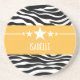 Trendy and modern Sassy Star Zebra Sandstone Coaster featuring a chic black and white zebra print background and a bold yellow border adorned with a fun star motif. This girly design may be customized with the personalized text of your choosing. Click "Customize It" to find more personalization options.