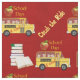 Happy group of teddy bear kids heading back to school in a little yellow school bus. Bus text says School is Cool, other typography says "Catch the Ride" and School Days. Sunshine, apples and chalkboard accents. Customize name on the two chalkboard areas with your child's name. Or delete the text if you wish that area without. Rich red background.
