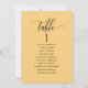 Help your guests find their table with this elegant yellow modern seating plan cards with guests names. Double sided cards so guests can look from both, front or back for their names. Clear space all around giving you the liberty to use clips or punch hole for hanging displays, or use table holder/frame. Yellow background and black text. Modern hand written calligraphy details. Several color options. Have all table numbers in same color or mix colors according to your event's color theme. Part of our "Elegant Yellow Event Signs and Products" collection with a variety of coordinating products available, including table number cards and menus.