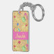 Show your love of sewing and quilting with this personalized key chain with your name or other words. Sewing and quilt lovers will enjoy this colorful, whimsy art of sewing notions - sewing machines, pin cushions, rotary cutters, spools of thread, pins and needles on a creamy yellow background with a fuchsia pink bar for personalization. This original art is by fabric designer Phyllis Dobbs. Accent colors are pink, green, red, blue and orange. Easy to customize. Show your love of sewing!