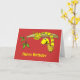 This reptile birthday card has a cute cartoon smiling snake image. It's yellow and brown and curled in a tree branch, with its head hanging down and its fangs out.