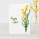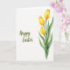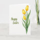 This design shows a bright white background with a cluster of three cup-shaped yellow flowers rising along the right side, painted with soft watercolor-like washes. The petals shift from sunny yellow to deeper golden tones near the bases and edges, giving them a tender glow that feels like a quiet gift between close friends. Slender green stems hold the blooms, while long curved leaves spread outward in mixed olive and emerald shades, adding gentle depth and a fresh spring look 🌷. On the left side, a flowing cursive message sits with plenty of open space around it, like a note left for someone special. The lettering is sage green and placed slightly above center, balancing the tall floral arrangement on the opposite side. The wide white space keeps everything airy and calm, letting the warm yellows and cool greens stand out without crowding the scene 🐇. The three blossoms lean slightly upward and inward, with the leaves fanning below them in soft, brushed arcs.