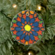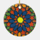 A colorful round ornament with a traditional Islamic pattern consisting of a yellow star, surrounded by geometric shapes in blue, orange, terracotta and green, all outlined in black. The design is from a screenprint by Judy Adamson.