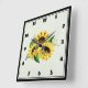 A clock with a pretty flower bouquet with cheerful yellow sunflowers and green leaves. Fresh and fun.
