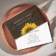 Rustic sunflower business card, with a yellow country floral image on a dark wood background. With simple typography, you can customize with your own name or title. The back of the card has a white background and black customizable lettering. Great for getting the word our about your business.
