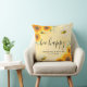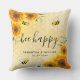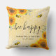 A pillow as a wedding gift or keepsake. A golden background with a bee honeycomb pattern and happy smiling bumble bees. Decorated with yellow and orange sunflowers, florals and greenery. Personalize and the names of the couple. black letters. The text: bee happy written with a modern, large hand lettered style script with swashes.