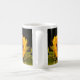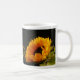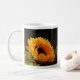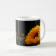 Photograph of a single yellow sunflower against a dark background. Image printed on both sides of the mug.