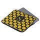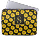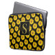 A pattern of bright yellow sunflowers on black background with a black and gold monogram.