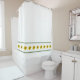 This shower curtain features a border of sunflowers with a green line above and below the border. The background is white. You can customize the curtain with your own photo if desired. You may contact me at jen@jenaleefamilystorykeeper.com if you need help.