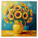 A beautiful tile with a gorgeous illustration of a yellow sunflowers in a pretty yellow vase done in an impasto style.
