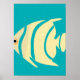 Illustrated stenciled design of a tropical yellow fish against a textures blue backdrop