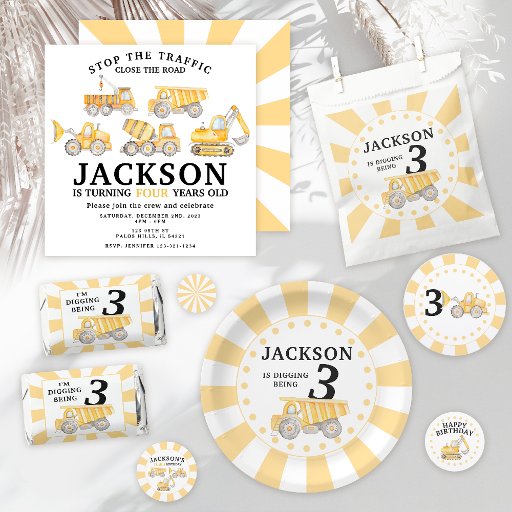 Watercolor yellow under construction site trucks birthday boy party paper plates.