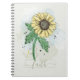Notebook with watercolor yellow sunflower in an sketchy doodle style on the front, with "faith" written below in a swirly font (can be changed to word or name of your choice).