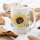 Elegant country style sunflower custom coffee mug. Our design features our hand-painted watercolor golden yellow sunflowers, white cream florals, and natural greenery arranged to create this elegant country-style arrangement. Our floral yellow sunflowers wrap around the coffee mug. Customize with your name and monogram. All flowers are hand-painted by Moodthology Papery.