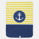 Nautical yellow and navy blue baby blanket design with anchor. Area for customized name of the baby.