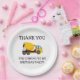 Yellow cement mixer truck child's birthday party "thank you" paper plates. Text says, "Thank you for coming to my birthday party"