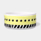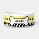Super cute dog food bowl featuring a trendy yellow zebra stripe, a black and white zebra stripe, black dots and a dog bone with your dog's name in the bone.