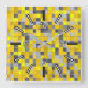 This square clock design features a grid-like tiled squares pattern colored various shades of yellow and gray. It also features rectangles marking the hours, and numbers indicating the hours "12", "3", "6", and "9".