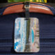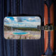 This luggage tag is shown with a photo print of a beautiful volcanic hot pot in Yellowstone National Park.