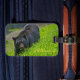 This luggage tag is shown with a photo print of a wild black bear in Yellowstone National Park.