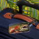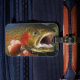 This luggage tag is shown with a photo print of a fish caught wild in Yellowstone National Park.