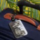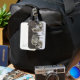 This luggage tag is shown with a photo print of wild wolves in Yellowstone National Park.